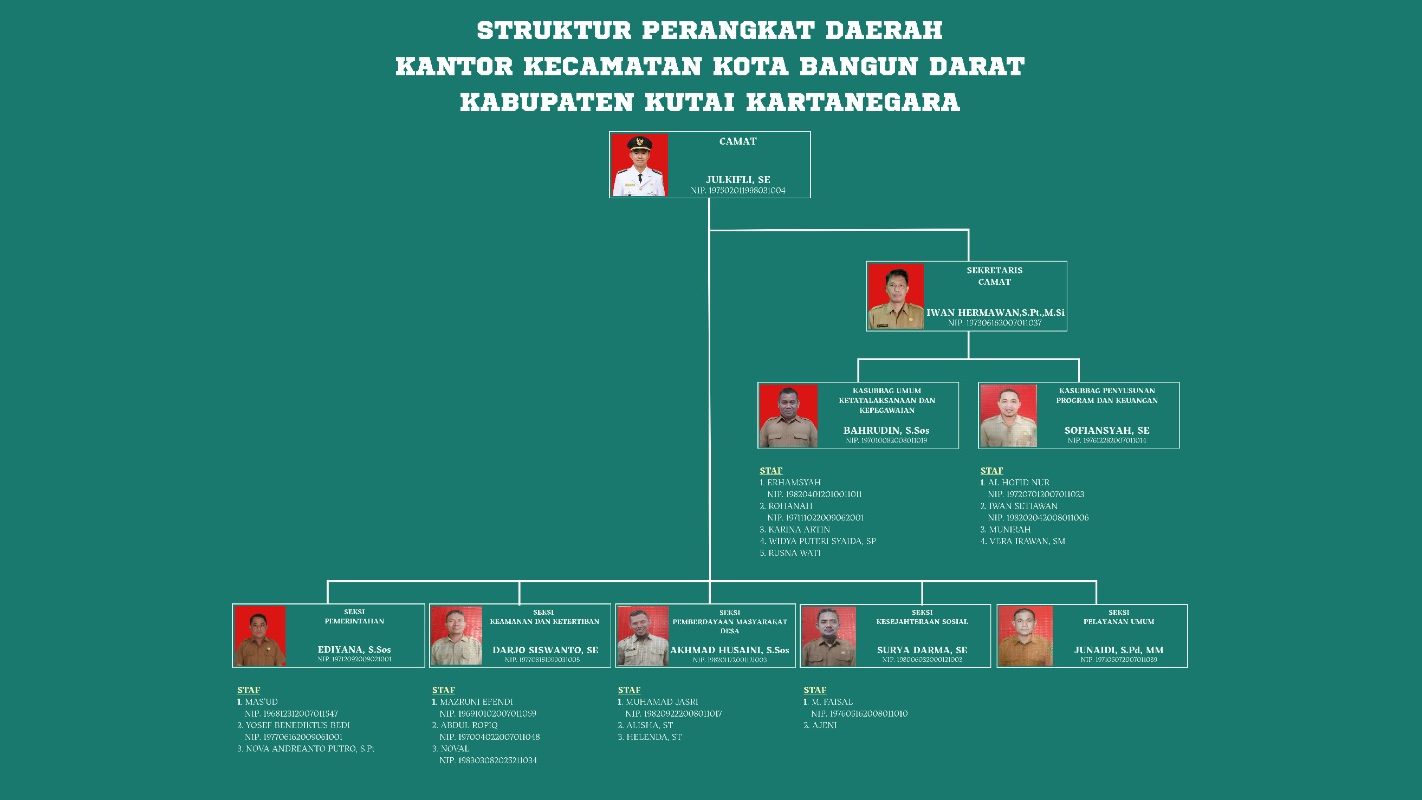 "Kecamatan Kota Bangun Darat berkomitmen untuk melayani masyarakat dengan baik, transparan, dan terus berkembang. Kami berharap informasi yang ada di website ini bermanfaat bagi warga dan dapat mendukung kemajuan bersama."